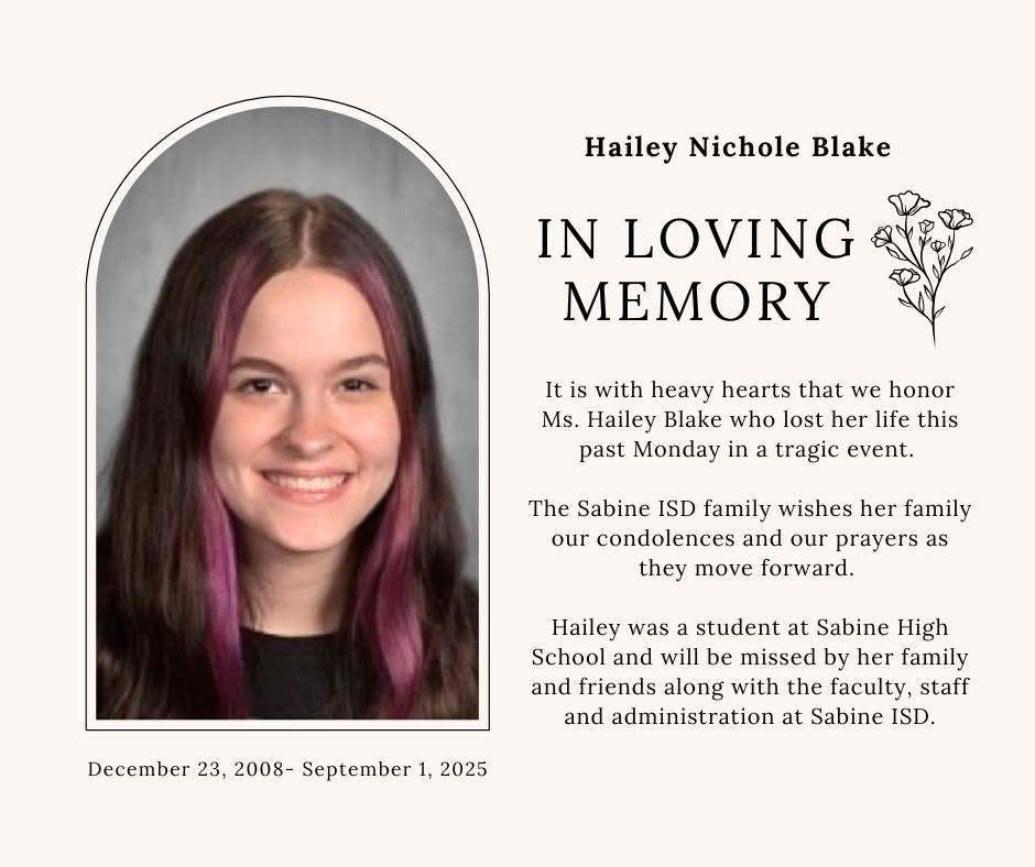 It is with deep sadness that we share the passing of Hailey Nichole Blake, a beloved student at Sabine High School, who left us far too soon this past Monday.